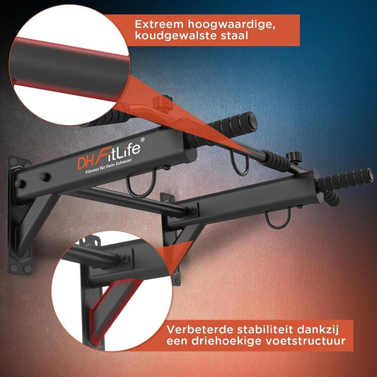DH FitLife 4-in-1 optrekstang voor wandmontage met spreidplug, multifunctionele pull-up bar voor thuis tot 200 kg | 6 antislip handgrepen | 3 ogen voor bokszak & slingtrainer | veilig en stabiel